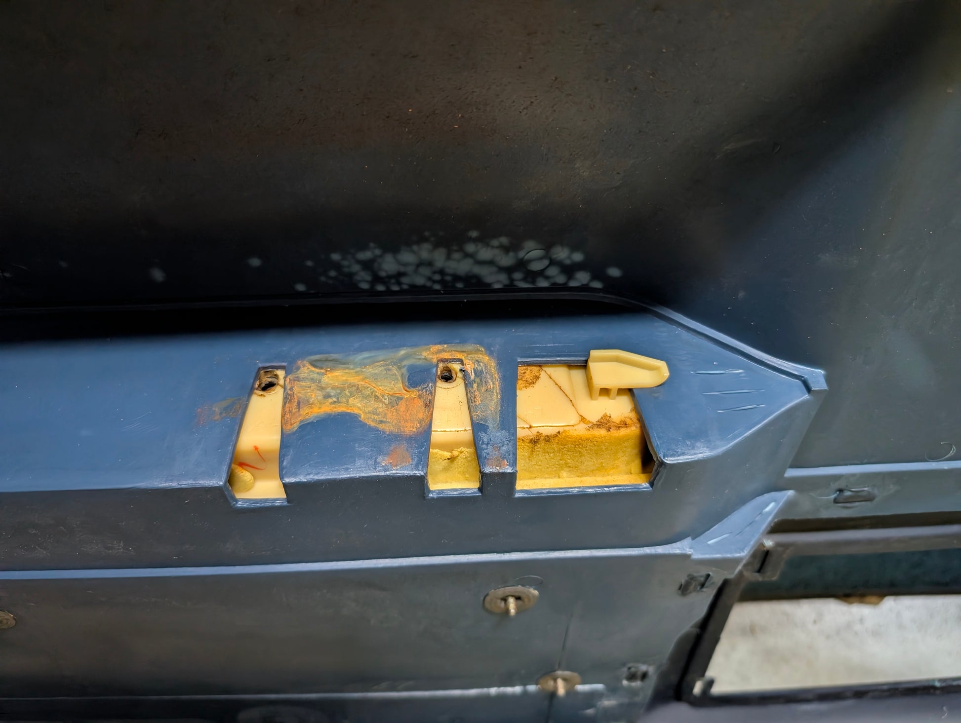 In good used condition. Some typical wear - scuffs, markings, cloth is a bit worn on-top, and armrest mounts are not all solid, but only some fading and the panel overall cleans up great.